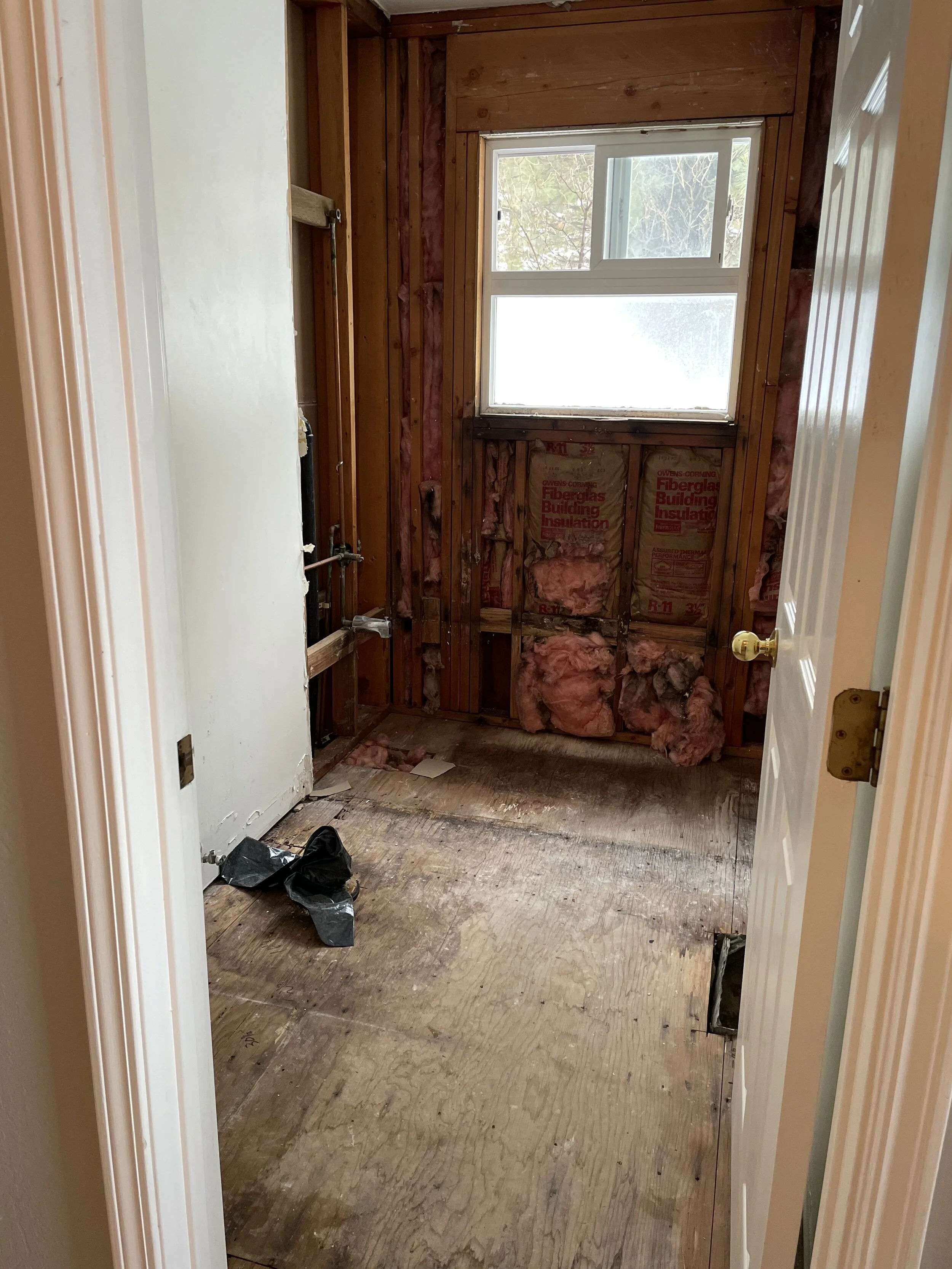 Full Gut: The only thing salvageable was the drywall in the front half of the room. Everything else had to go! Notice the placement of the bathtub spout, spoiler alert, that moves. The good news, the wood was in better shape than we thought!