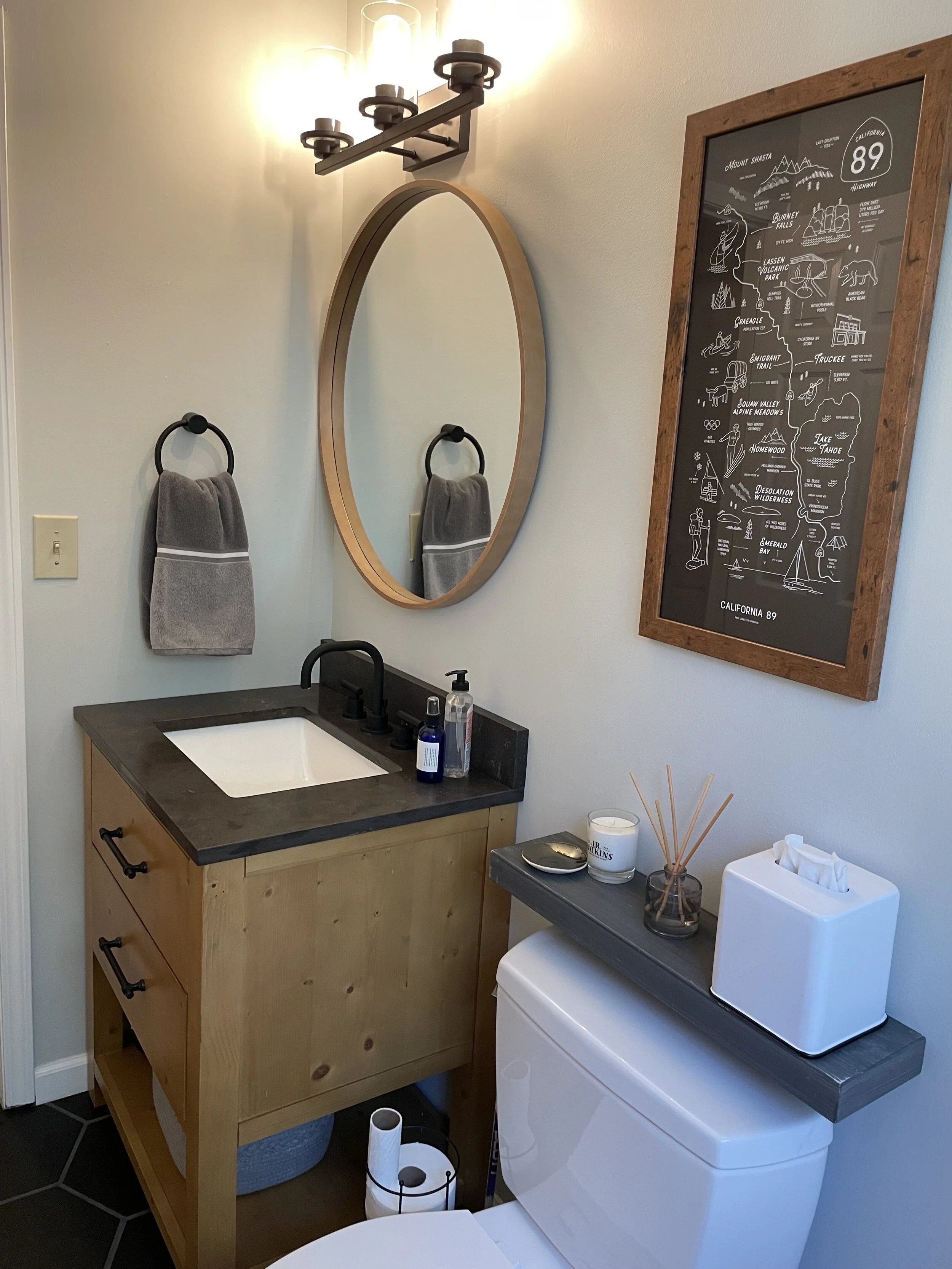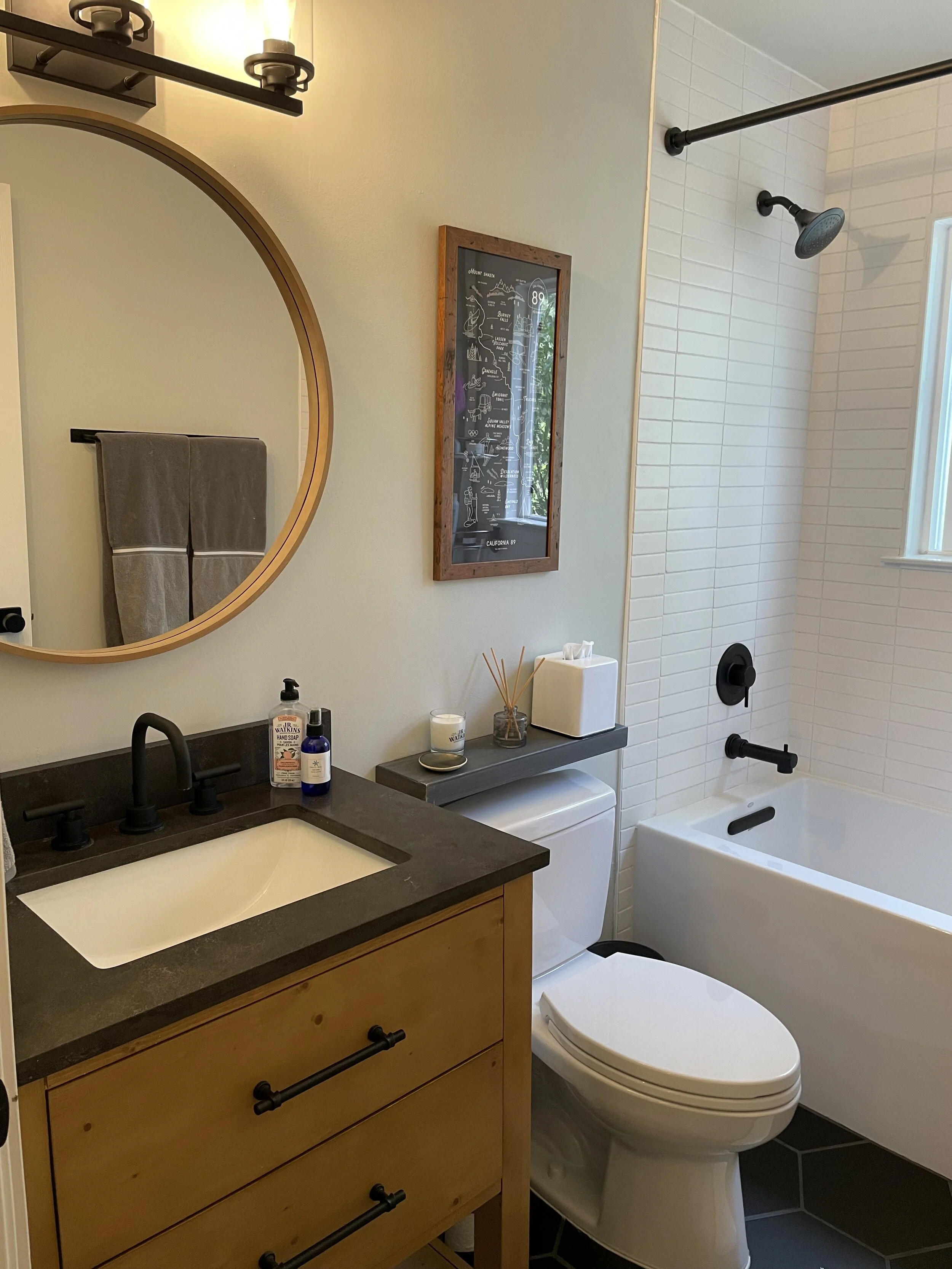 Finished product! The vanity came from Wayfair all in one piece with the countertop and sink installed (note, the first one was shattered so they immediately replaced it at no cost and no questions. They have the best customer service!). I went with a light wood to balance the dark flooring and countertop, but add some organic color and warmth. The matte black faucet tied nicely into the other black accessories and shower trim kit to create a cohesive, finished look.We opted to forgo the medicine cabinet due to the stud running directly behind it, there was a limit to what Billy was willing to pay for at this point. But in the end we didn’t miss it. Note: Target has the best inexpensive mirrors if you just need a surface mounted option. And by using one with a wood frame the vanity was no longer the only thing in there in that wood.